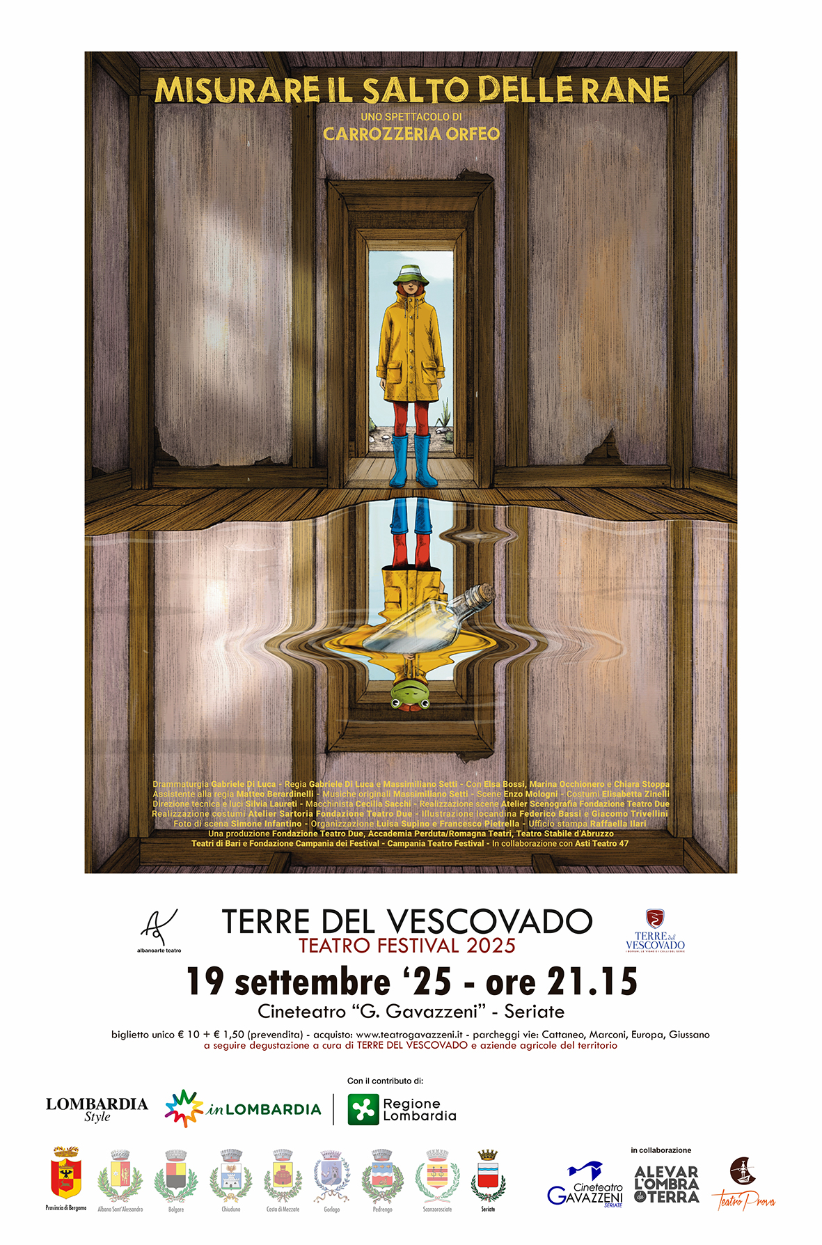 Misurare il salto delle rane è una dark comedy ambientata in un piccolo paese di pescatori negli anni ’90. Protagoniste sono tre donne di diverse generazioni – Lori, Betti e Iris – unite da un tragico lutto avvenuto vent’anni prima e ancora avvolto in un’aura di mistero. Il paese emerge come un frammento dimenticato, circondato da un vasto lago e da una palude minacciosa che lo isola dal mondo esterno, un microcosmo sospeso tra arcaismo e quotidianità, dove una piccola comunità persiste ancorata a consuetudini superate. Partendo da questo habitat, la nuova produzione di Carrozzeria Orfeo, senza rinunciare all’ironia che la contraddistingue, è un’indagine poetica e tragicomica sulla condizione umana contemporanea: un viaggio nell’intimità di tre esistenze femminili che si specchiano l’una nell’altra e che, in modo diverso, rifiutano etichette imposte dall’esterno. Tre età, tre mondi, tre stagioni della vita che intrecciano le loro esistenze, scavate da lutti e assenze, ma anche da rinascite, alleanze e complicità profonde. Nucleo pulsante della narrazione è proprio il femminile. Le manifestazioni della violenza e dell’oppressione verso le donne, endemiche nei contesti rurali dell’epoca, affiorano nel tessuto sociale della comunità con modalità sottili ma pervasive. I personaggi maschili incarnano quasi invariabilmente figure di minaccia o fallimento. Lo spettacolo esplora le contraddizioni dell’esistenza: la pesantezza e la leggerezza, il dolore e il riso, il radicamento e il desiderio di evasione. Attraverso dialoghi taglienti e situazioni paradossali, momenti di puro lirismo e gesti simbolici, che si intrecciano nella narrazione, alternando momenti di intensità visiva a passaggi di caustica comicità, Carrozzeria Orfeo costruisce un racconto intimo, in cui la gravità del dolore si affianca alla leggerezza dell’ironia.
