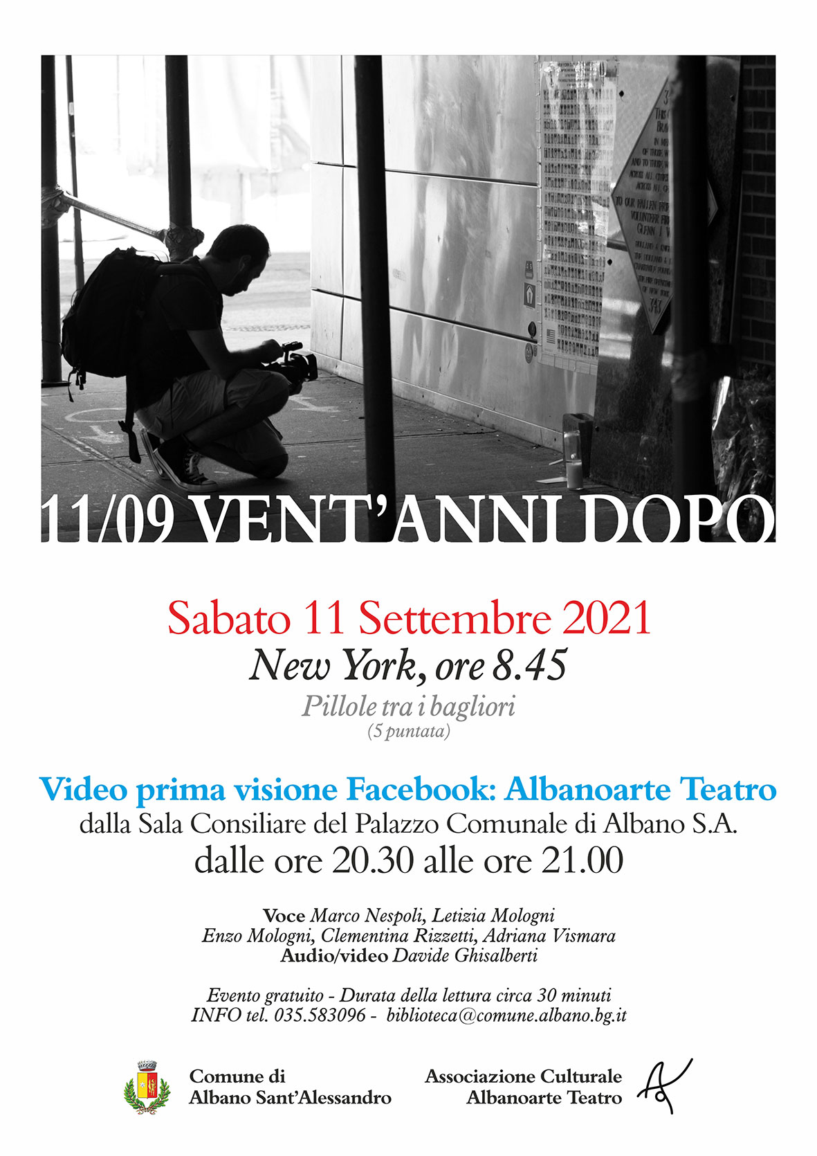 Dopo Etty Hillesum, Rino Gaetano, Bartolomeo Sacco e Nicola Vanzetti, Louis Armstrong il quinto appuntamento con “Pillole tra i bagliori” racconta gli attentati che colpirono gli USA l’11 settembre nel 20° anniversario. L’America è sotto attacco. Le Torri sono colpite, bruciano e crollano. Mentre il suolo di Manhattan trema il mondo intero assiste in diretta. Assistono anche i giornalisti ma la semplice, granitica Regola delle Cinque W – who? what? when? where? why? – su cui si basa tradizionalmente il giornalismo, s’inceppa nell’ultima domanda (perché?) prima ancora di essere tradotta. Albanoarte Teatro propone “New York, ore 8.45″ semplicemente leggendo due articoli scritti da giornalisti Premi Pullitzer che hanno saputo leggere gli eventi con estrema lucidità. Il primo racconta i fatti il giorno dopo ed è a cura dello staff del Wall Street Journal. Il secondo è firmato da C.J. Chivers che dopo aver aiutato i soccorritori a Ground Zero, raccontandoli in prima persona, venne mandato dal New York Times in Afghanistan come corrispondente di guerra e da lì che scrisse il lungo reportage che accomunò le tragedie di due popoli, quello americano e quello afgano.