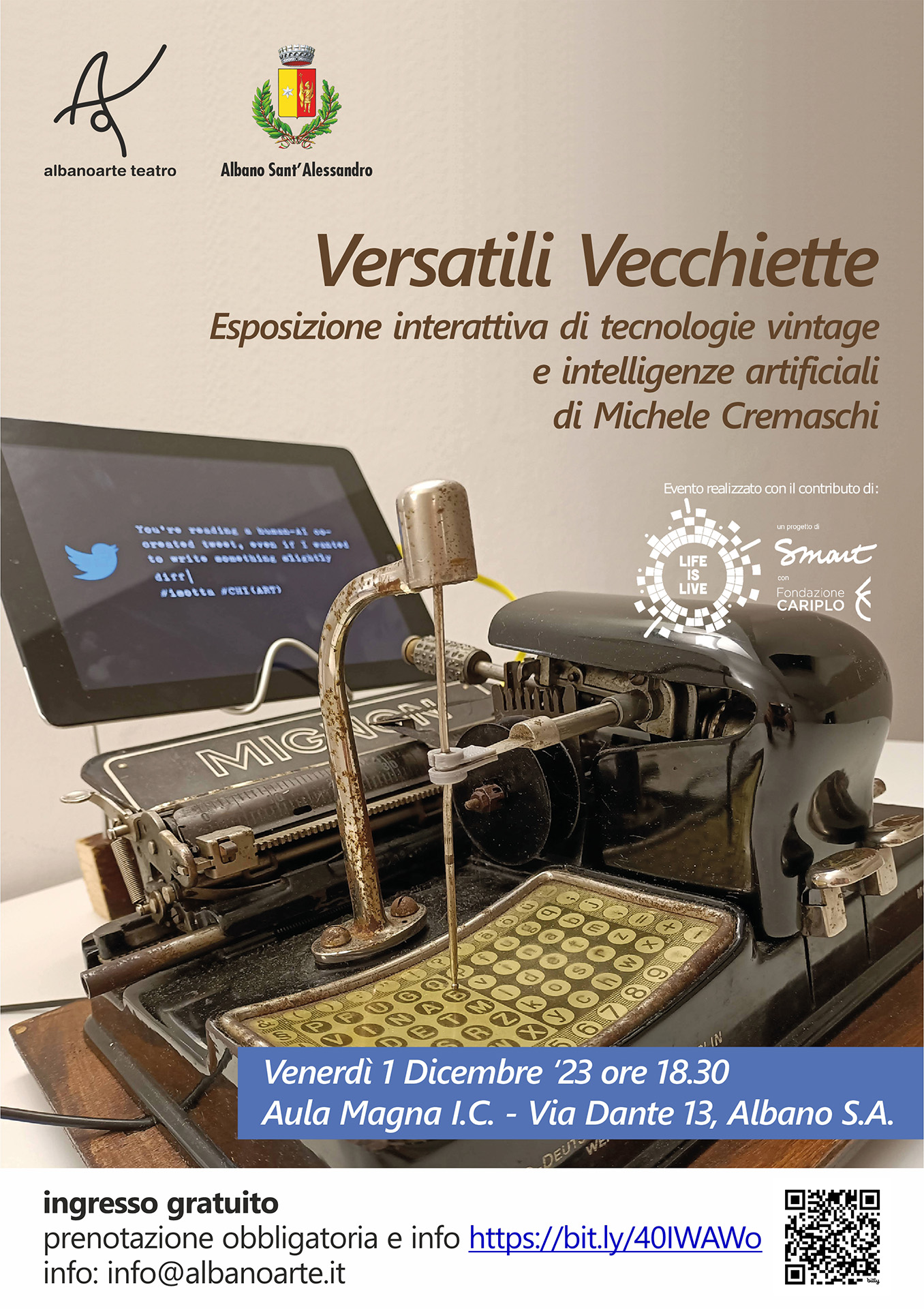 Michele Cremaschi, artista bergamasco ricercatore nell’ambito del binomio teatro e nuove tecnologie, porta ad Albano Sant’Alessandro il suo ultimo progetto sostenuto da Albanoarte Teatro ETS. L’esperienza di “Versatili Vecchiette” è una visita partecipata a macchinari ibridi che ci interrogano sulle sfide poste dalle Intelligenze Artificiali. Una macchina da scrivere, un magnetofono a cassette, un proiettore di diapositive dialogano con le più recenti tecnologie di Machine Learning. Il fascino del vintage si fonde in modo inconsueto all’inquietudine che suscita l’accelerazione costante della tecnologia. A metà strada tra una conferenza, uno spettacolo e un’esposizione, una serata che vuole aprire uno spazio di riflessione e dialogo tra i partecipanti.