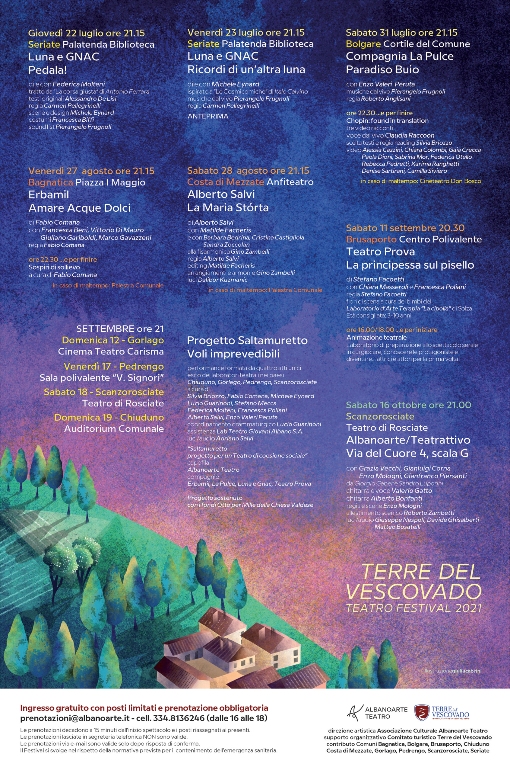 TdV Teatro Festival torna a distanza di due anni ad animare nove paesi che fanno parte del Comitato Turistico Terre del Vescovado. Il programma creato da Albanoarte Teatro è un manifesto sostegno alle realtà teatrali bergamasche che si sono messe in gioco in “Saltamuretto – progetto per un Teatro di coesione sociale” di cui è capofila, ed i Comuni coinvolti hanno risposto con entusiasmo alla proposta. Saltamuretto riunisce artiste e artisti nella condivisione del proprio talento, in un dialogo di ricerca teatrale che ha come obiettivi l’incontro con il territorio, la messa in rete del pubblico ed il sostegno etico ai lavoratori dello spettacolo. Il progetto, che avrebbe dovuto debuttare quest’anno, a causa del prolungarsi dell’emergenza sanitaria è stato rinviato ma è attivo ed integrato nel Festival.